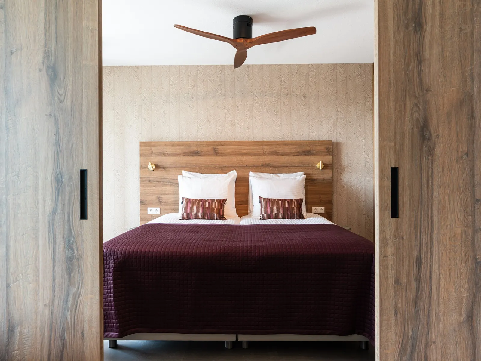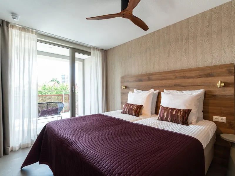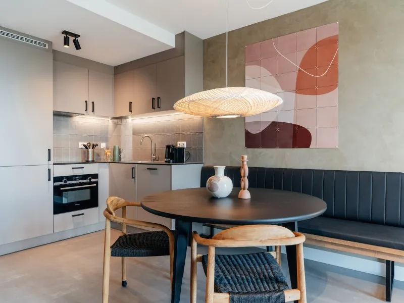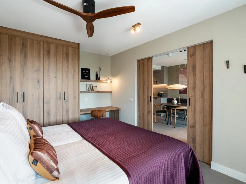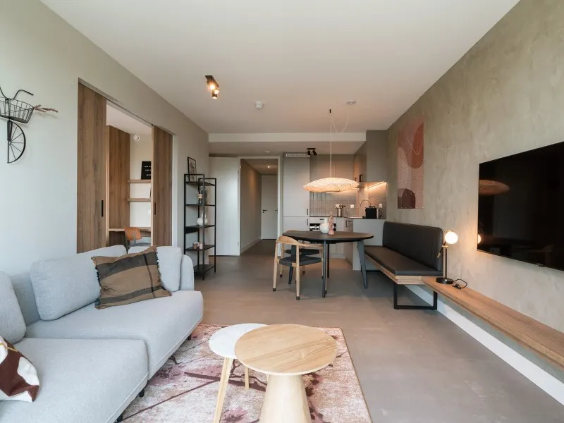 This 1-bedroom apartment, spanning 60 sqm, provides a more spacious option compared to the studio. It comfortably accommodates up to 2 guests and is suitable for both short and long stays. Upon entry, you'll immediately experience the inviting ambiance, consistently reflected in the interior design, characterized by a blend of natural colors and materials with contemporary technology. The apartment features a well-equipped kitchen, a dining area, a cozy sofa, and a large SMART TV with Chromecast. In the bedroom, you'll find a spacious and comfortable bed, a second SMART TV with Chromecast, a desk, and ample closet space. The generous bathroom includes a shower, a vanity with drawers, and a heated mirror. There's a separate toilet and a dedicated laundry room with a washing machine and dryer. The apartment also boasts a 4 sqm balcony. Notably, the electricity and heat you'll use during your stay are predominantly generated by solar collectors, contributing to the sustainability of BizStay Walden, making it an eco-friendly building.